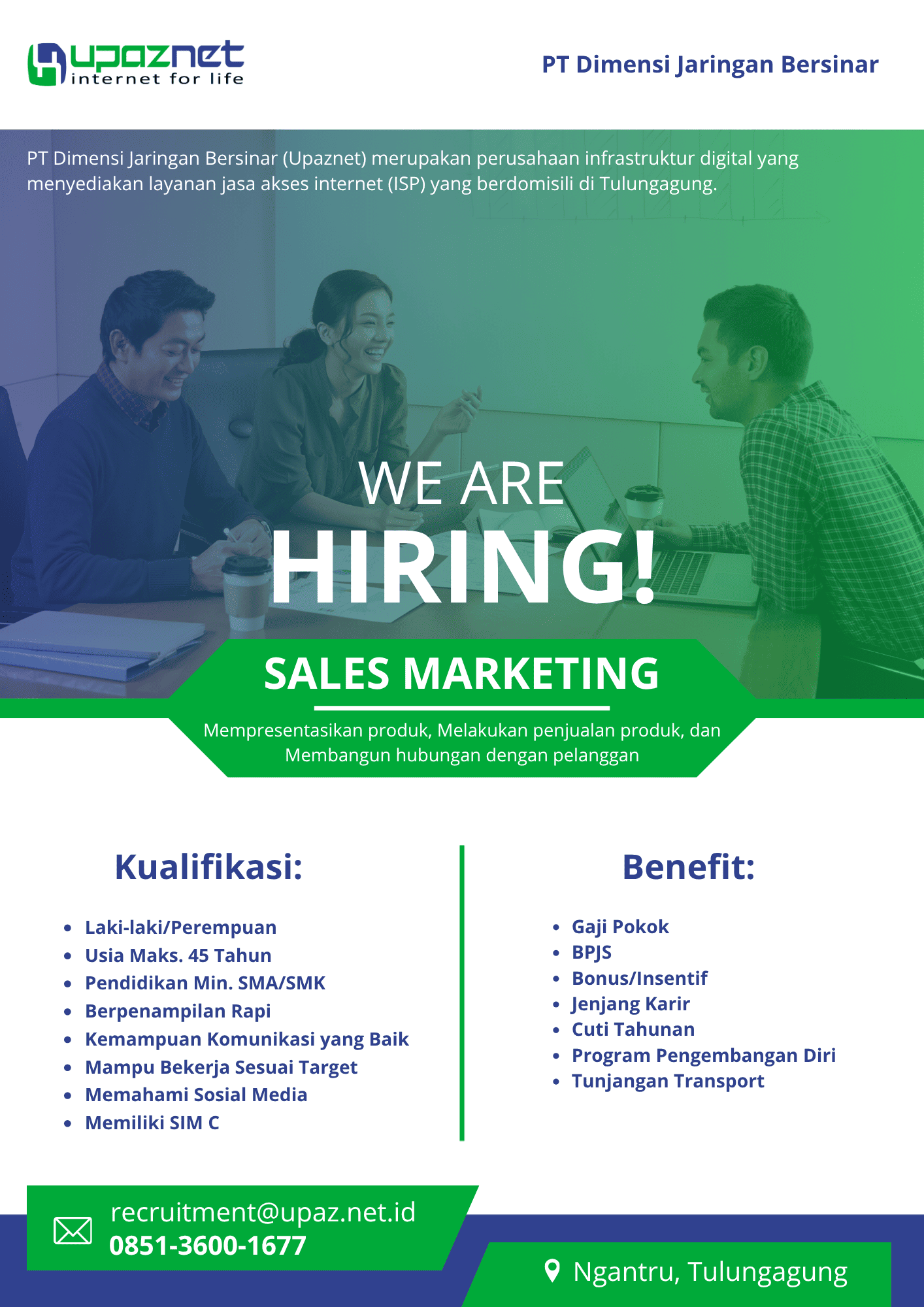 Bersiaplah untuk bergabung menjadi bagian dari Upaznet. Di Upaznet kami merangkul dan mengembangkan para talenta muda. Menciptakan suasana kerja yang positif dan produktif sehingga semua orang di perusahaan dapat berkembang dan maju bersama. Dalam mendukung hal tersebut berbagai keseruan kegiatan internal tercipta agar dapat meningkatkan rasa semangat dan kesolidaritasan antar karyawan. Mulai perjalanan karirmu bersama kami, berikan kontribusi terbaik untuk wujudkan digitalisasi Indonesia!